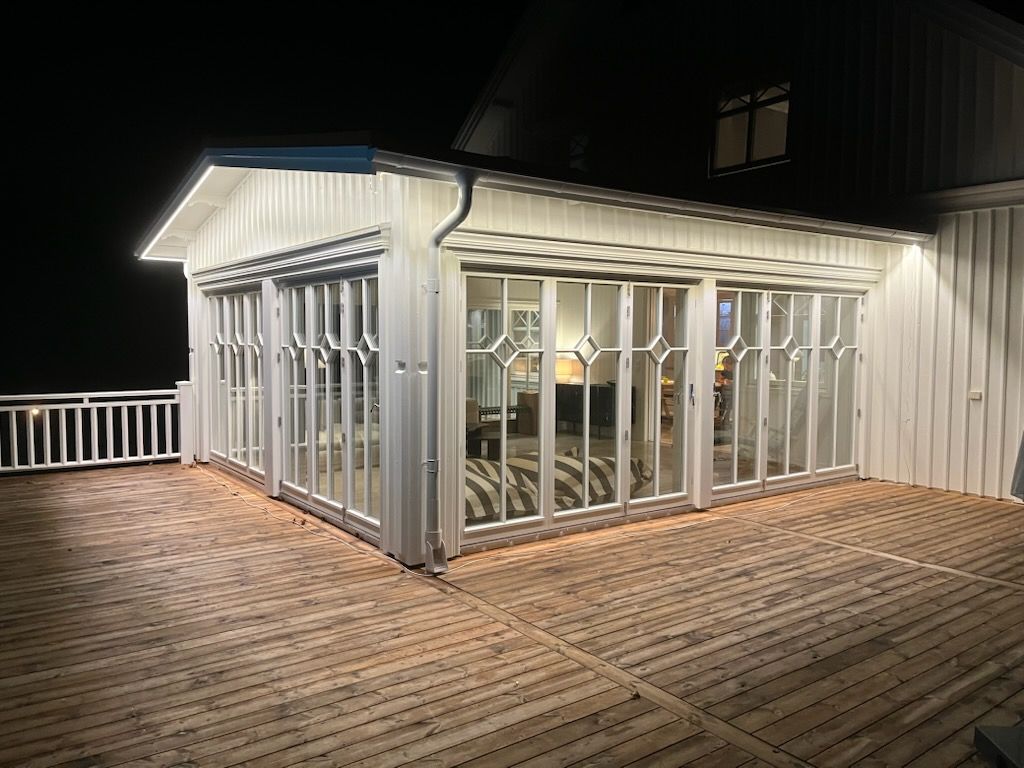 Härdat 3-glas som standard ger värme, tystnad och energieffektivitet året runt. Hela konstruktionen har låga 1,1 i U-värde.
